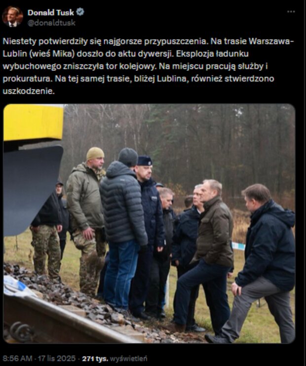„Niestety potwierdziły się najgorsze przypuszczenia. Na trasie Warszawa–Lublin (wieś Mika) doszło do aktu dywersji. Eksplozja ładunku wybuchowego zniszczyła tor kolejowy. Na miejscu pracują służby i prokuratura. Na tej samej trasie, bliżej Lublina, również stwierdzono uszkodzenie” – napisał szef rządu.